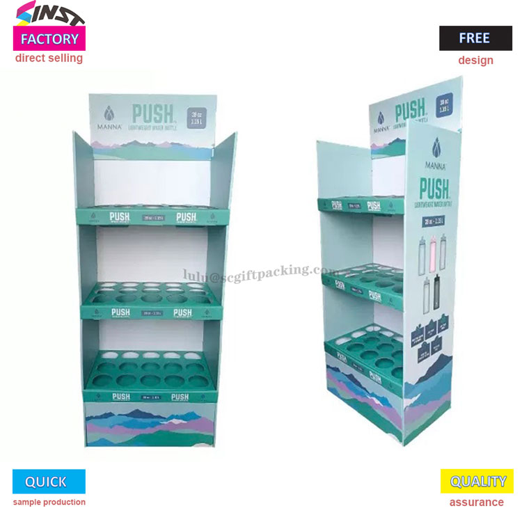 Цей картонний дисплей підлоги коробки підтримує пляшку з водою Supermarke, має тришарову конструкцію конструкції сітки, з круглими канавками на кожному шарі, щоб точно утримувати пляшку з водою та запобігти прокатуванню. Логотип бренду можна надрукувати вгорі, а графіка продукту може бути надрукована збоку, простий та високий клас. В основному використовується для відображення продуктів, таких як пляшки з водою, чашки, чашки з молоком, чашки термос тощо.