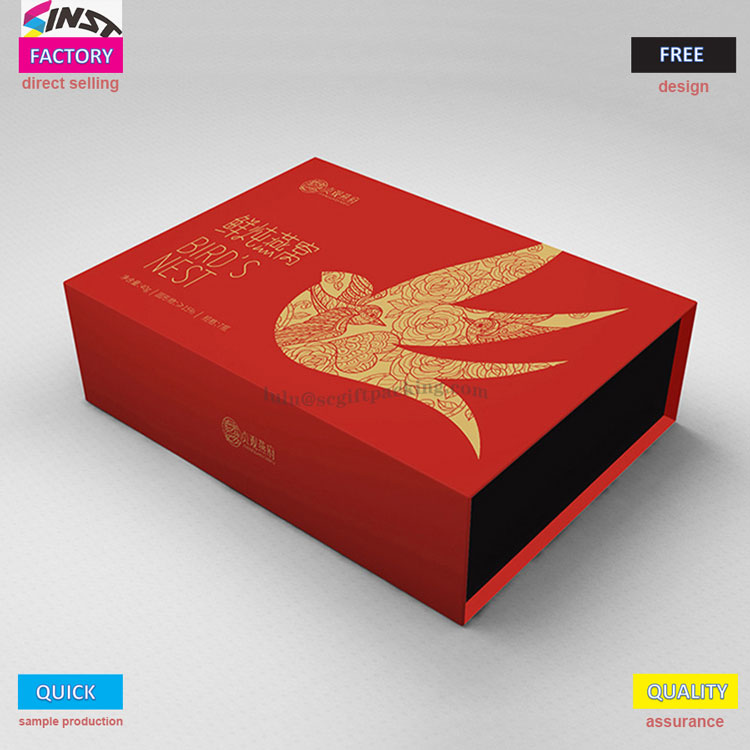 Ця подарункова коробка з високим класом Health Pird Nest Flip Cover заснована на розкішному збігу червоного та чорного кольору. Зовнішня коробка виготовлена з жорсткого картону з магнітним відкриттям та закриттям. Коли коробка відкривається, присутня внутрішня внутрішня точність пінопласту. Шість незалежних перегородків точно піклуються про кожну пляшку готового до їжі пташиного гнізда, яка має як візуальну красу, так і практичний захист. Будь то продається в торговому центрі чи дарує подарунки родині та друзям, щоб висловити свої почуття, всі вони демонструють стиль.