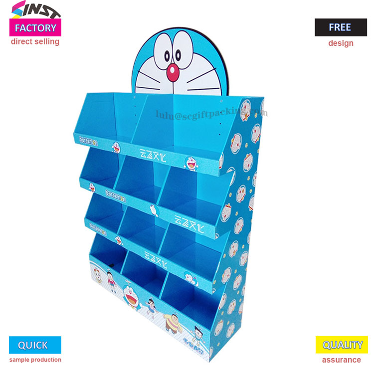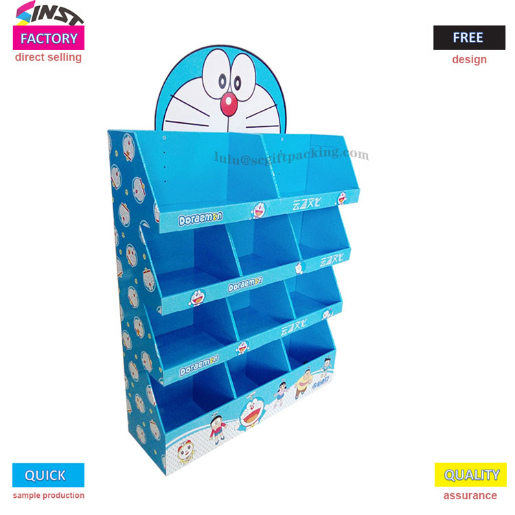 Ця торгова картонна стійка для торгового центру ідеально підходить для супермаркетів, магазинів зручностей або пекарень, що містять яскраво -сині тони та графіку мультфільму. Чотири шаруватого дизайну сітки з регульованими роздільниками дозволяють гнучку організацію печива, частування або закуски, максимізуючи ефективність простору на полиці.